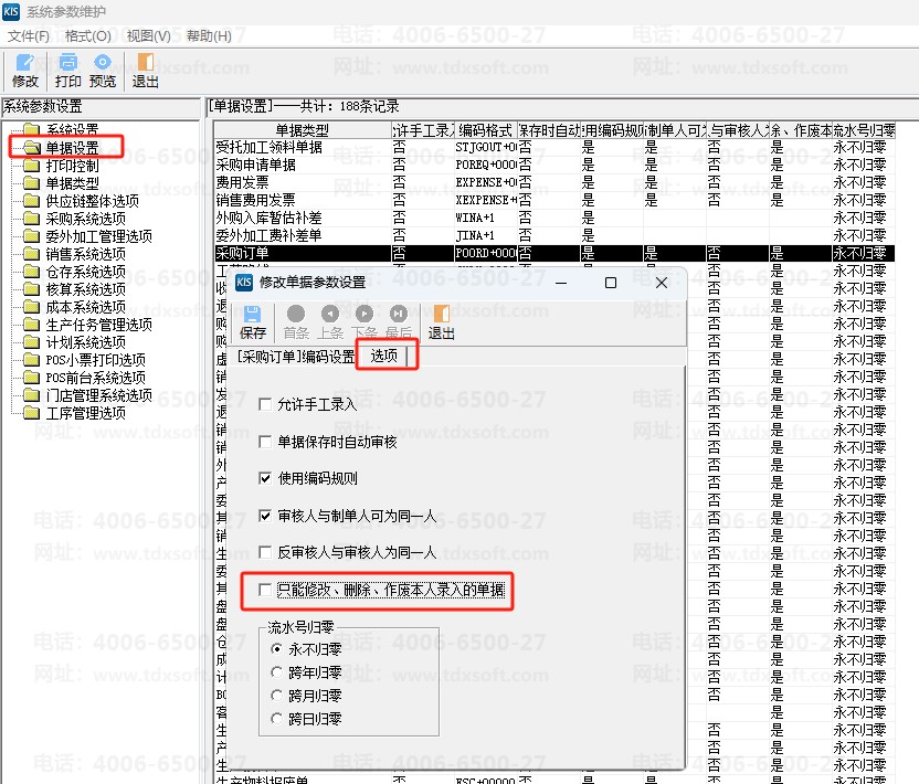 2、单击【单据设置】,双击打开需要设置的单据,点击【选项】,【只能修改、删除、作废本人录入的单据】参数不勾选即可。