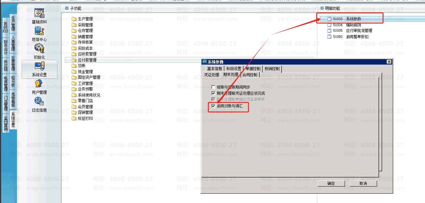在KIS主界面,依次选择【系统设置】→【系统设置】→【应付款管理】,再双击【系统参数】。进入系统参数设置界面,选择【期末处理】页签,可取消勾选“启用对账与调汇”,如应付系统已结束初始化。则参数“启用对账与调汇”无法取消。