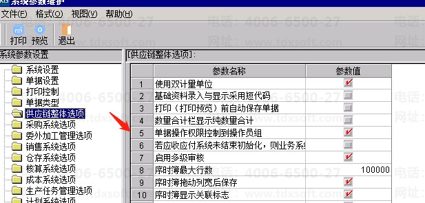 2、设置完分组之后,找到【系统设置】-【系统参数维护】-【供应链整体选项】的5号参数【单据操作权限控制到操作员组】,勾选后不同分组下的用户无法看到其他组的业务单据。
