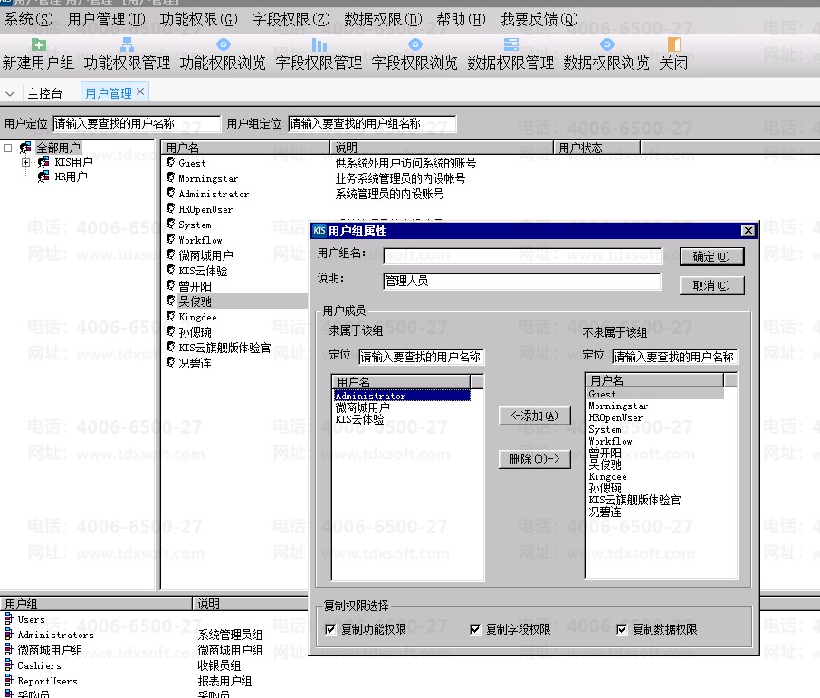 1、【系统设置】-【用户管理】,新建分组,在用户组属性内根据实际业务需要将不同业务员分别设置不同的分组