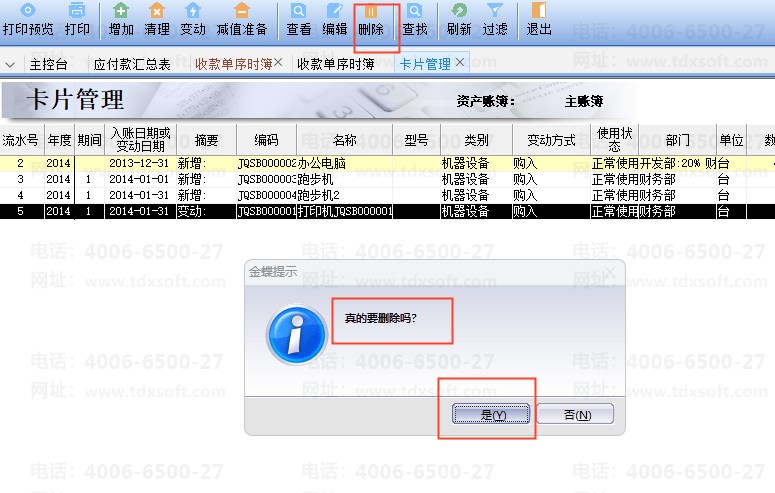 3、进入卡片管理界面,找到需要删除的卡片记录,单击工具栏[删除],弹出金蝶提示:真的要删除吗?单击[是]即可。