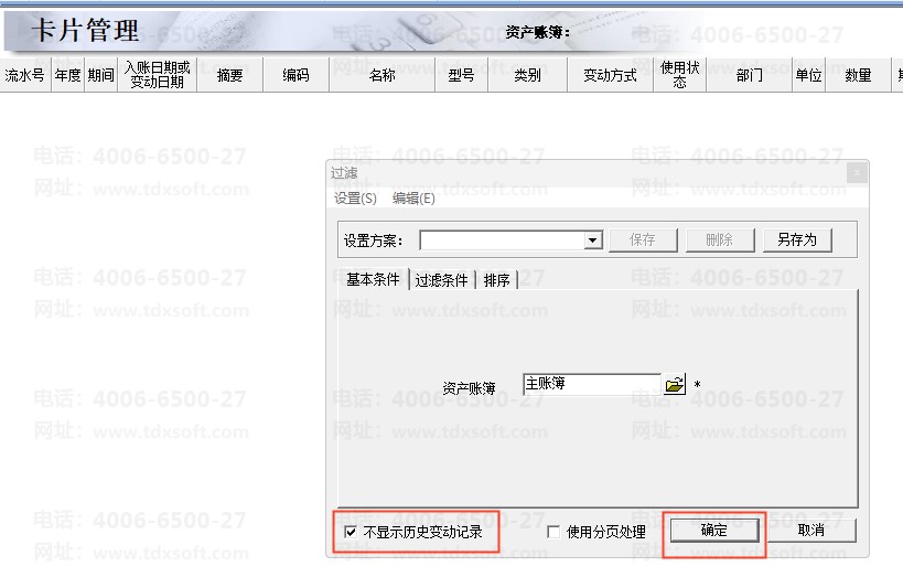 2、系统弹出过滤界面,勾选“不显示历史变动记录”单击[确定];