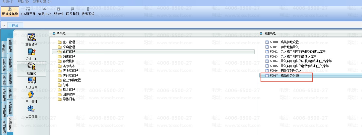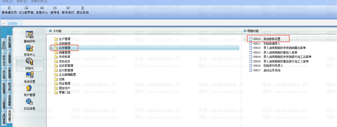 1、使用有权限的用户登录主控台后,依次单击[系统设置]→[初始化]→[仓存管理],双击明细功能[系统参数设置];