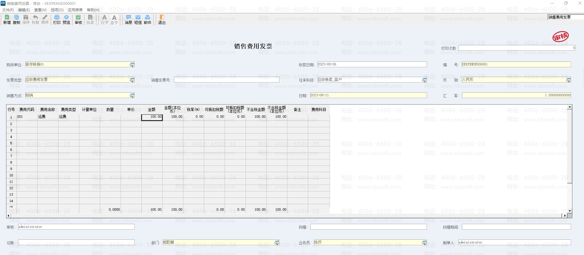 在[供应链]→[销售管理]→[费用发票]新增一张销售费用发票;保存成功后,系统会自动生成一张其他应收单
