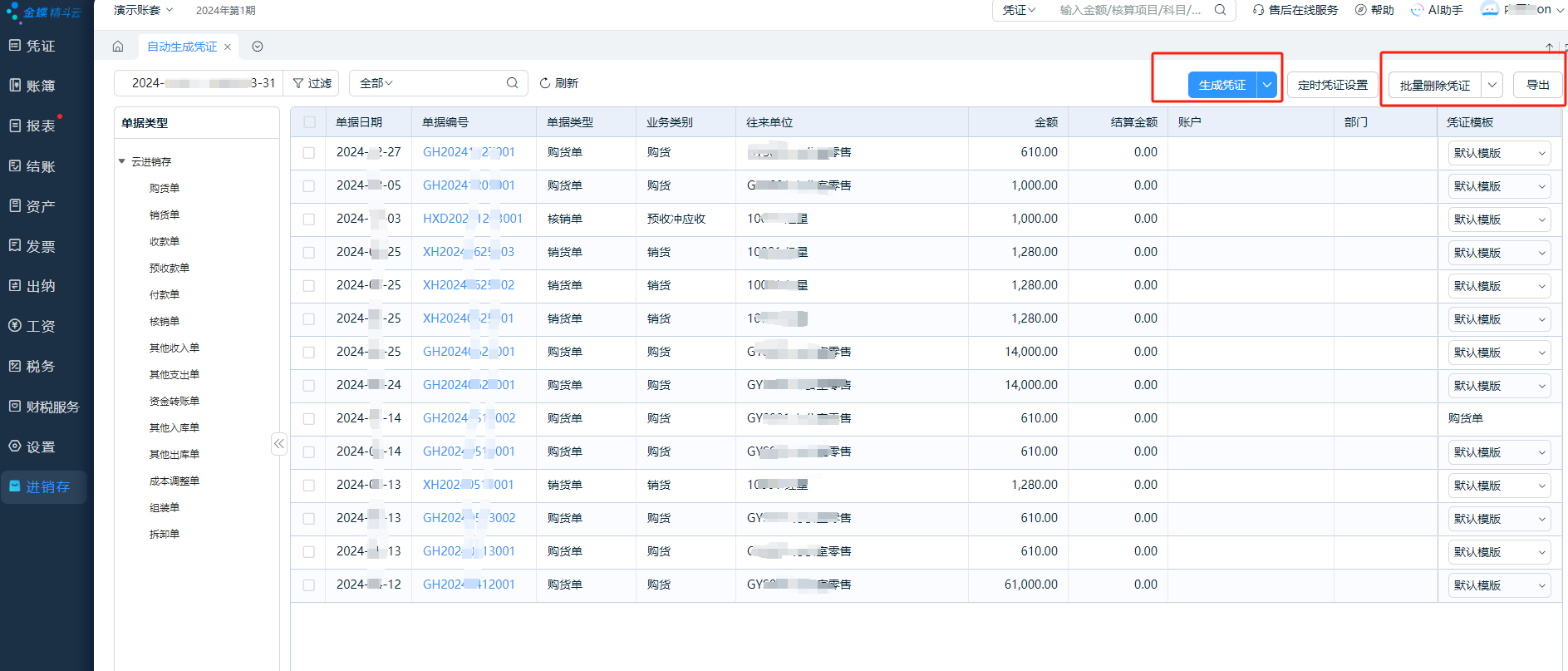 筛选出相关单据,点击【生成凭证】可以一键生成凭证,同时,对已经生成的凭证支持批量删除凭证/暂存凭证与导出。
