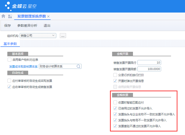 “已使用过的发票不允许导入”、“发票抬头与企业名称不一致的发票不允许导入”、“发票抬头与税号不一致发票不允许导入”、“发票查验不通过的发票不允许导入”等四个参数在单据上使用发票无忧助手收票时生效。参数启用时,不符合条件的发票会在发票无忧助手的已选发票界面有相应提示并在导入发票时排除