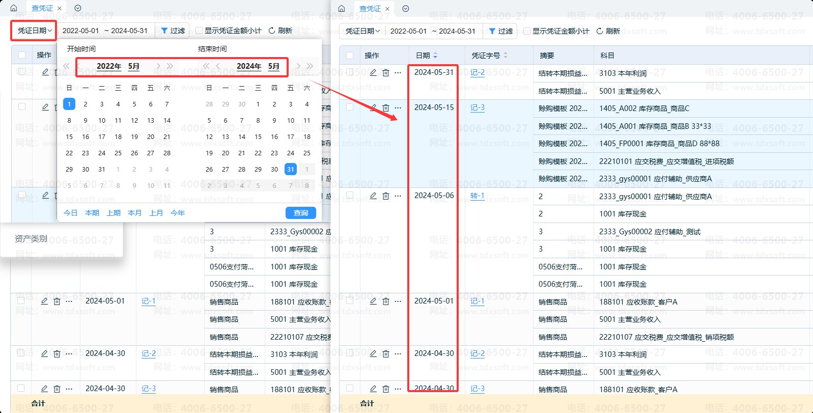 ②按“凭证日期”查询:在【查凭证】列表,查询【开始时间】最早为系统启用月份,【结束时间】为凭证所在的最近月份。