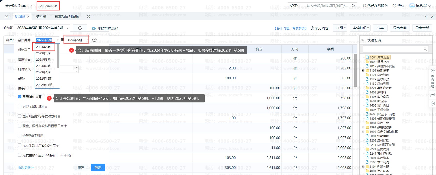 ②多栏账和查凭证一样,【开始期间】最早为系统启用期间,【结束期间】为凭证所在的最近期间