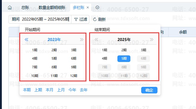 【开始期间】选择范围是系统启用期间至当前账套会计期间,再加上12期。