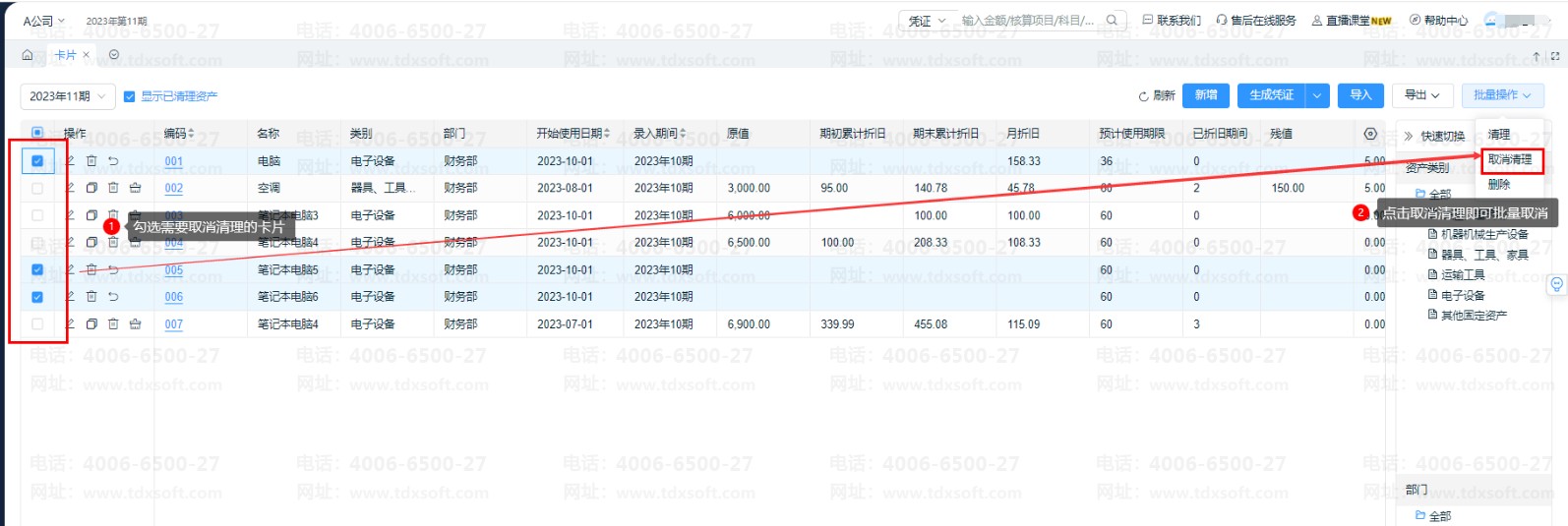 固定资产卡片也支持批量取消清理,在卡片列表中勾选已清理的卡片再点击右上角【批量操作】-【取消清理】即可批量取消。