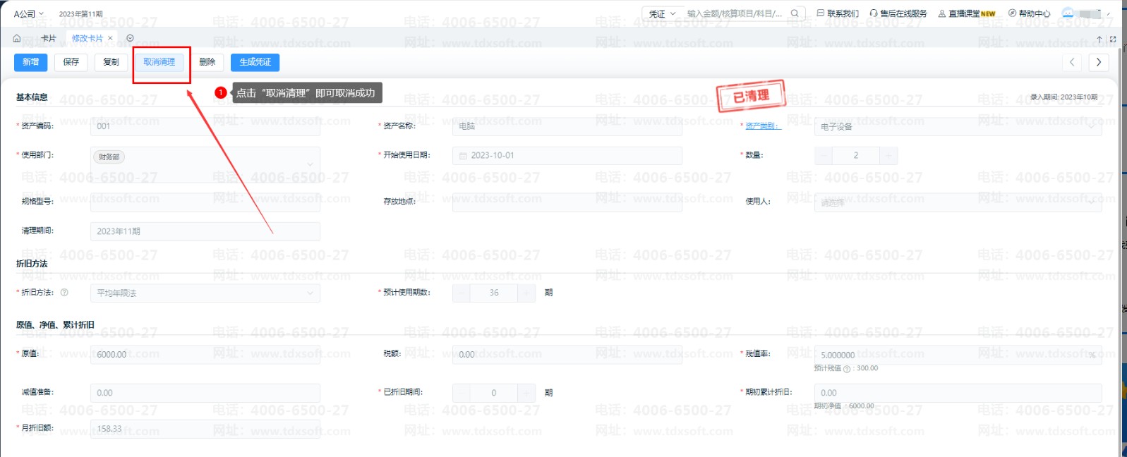 1、已经生成清理凭证的卡片不能取消清理,需要删除清理凭证后才能取消。