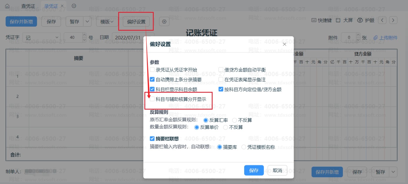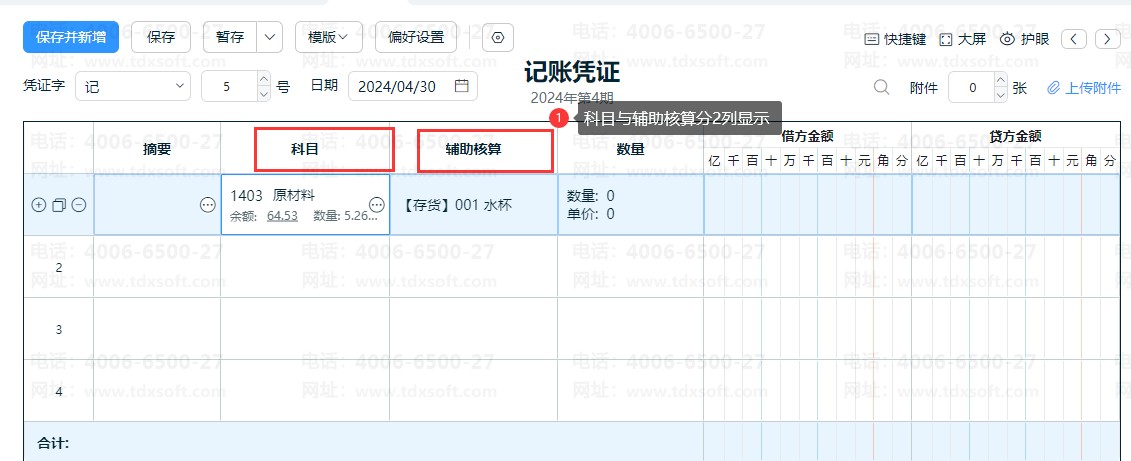 在录入凭证的界面,点击【偏好设置】,勾选“科目与辅助核算分开显示”参数即可分列显示,取消勾选则代表合并为一列显示,如图: