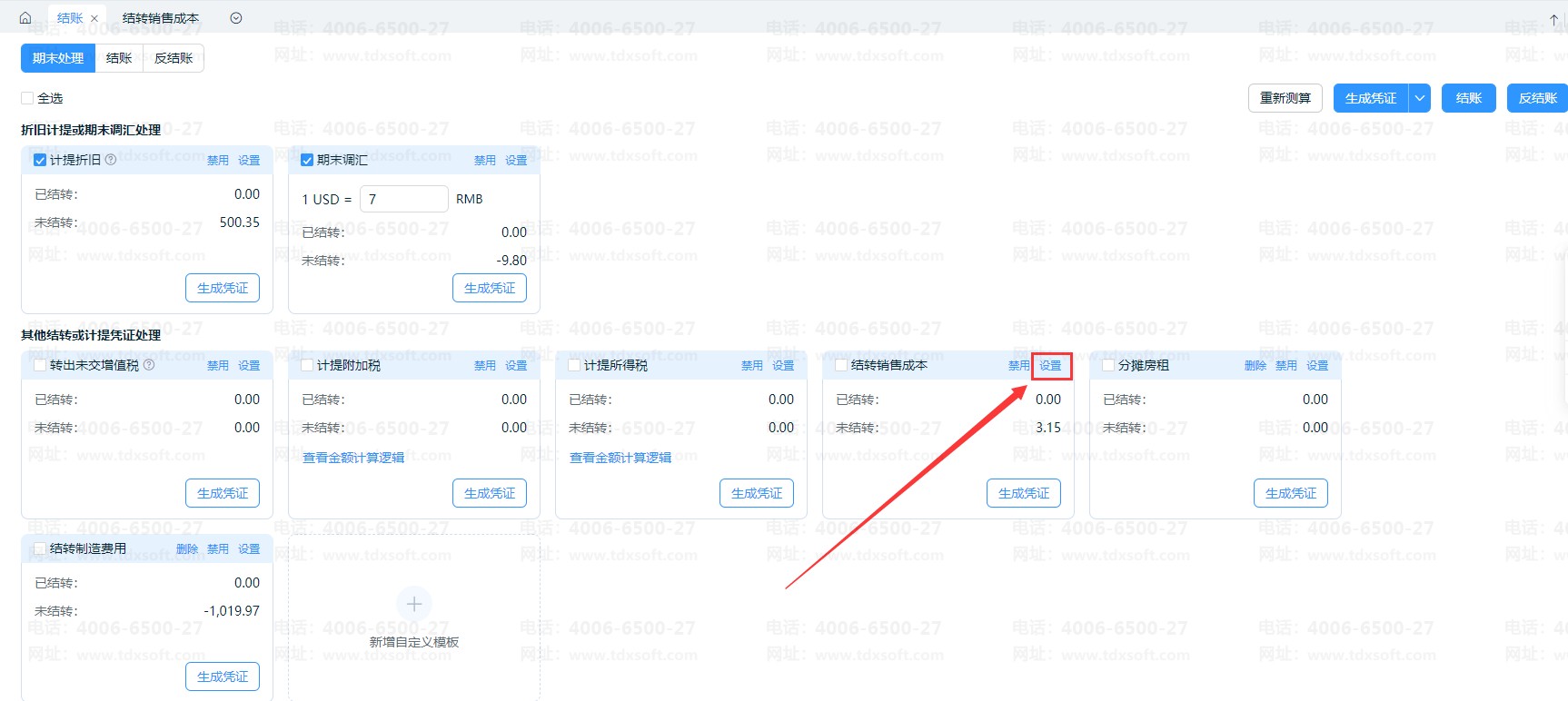 菜单栏点击【结账】-【结转销售成本】,点击设置进入到设置界面