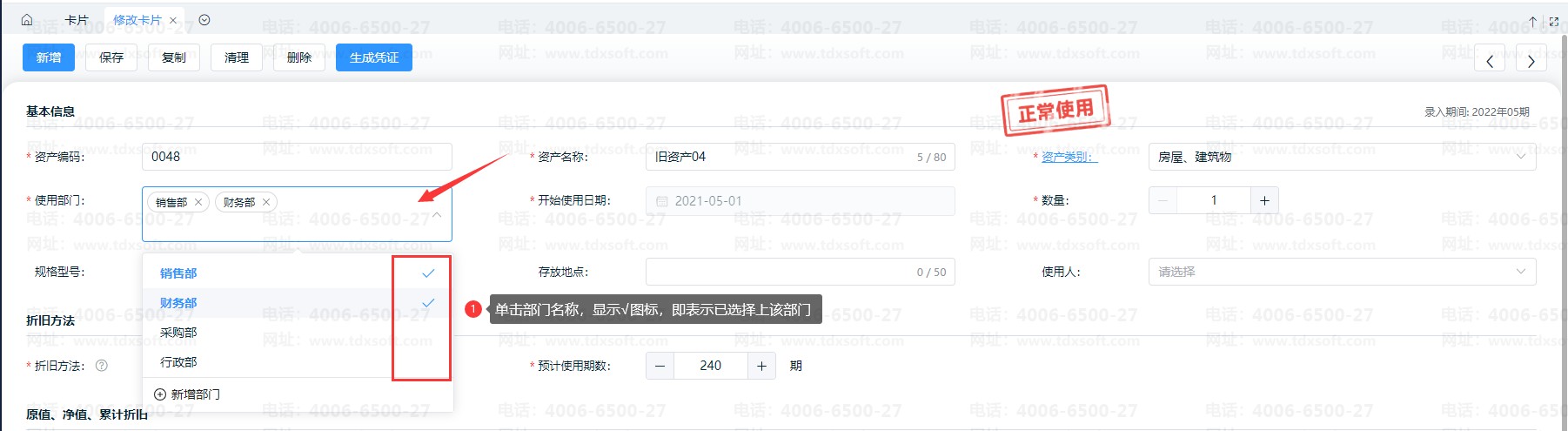 2、在卡片详情界面,固定资产支持按一个部门或是多个部门分摊折旧。