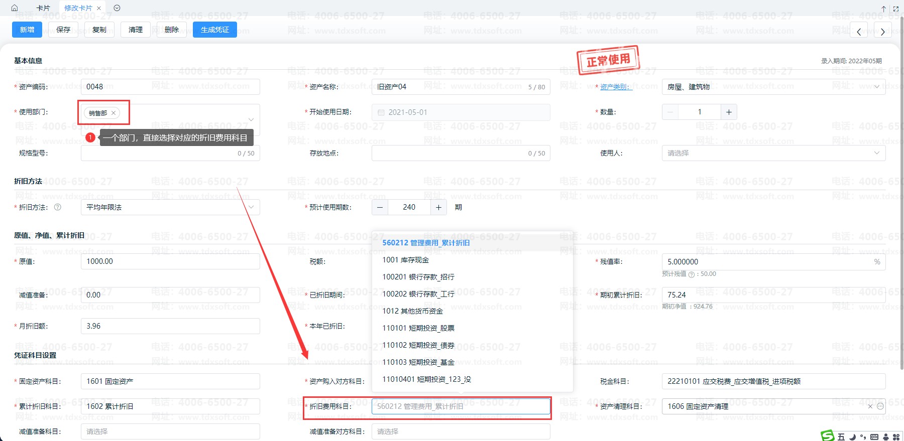 如需每月修改折旧费用部门分摊比例,先修改卡片中的折旧费用各部门分摊比例,再去生成折旧凭证。