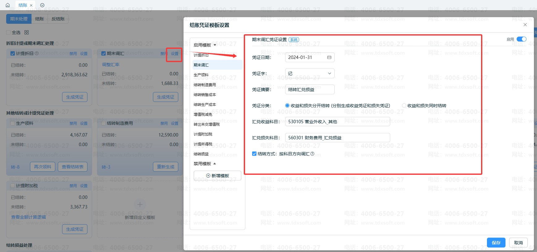 也可以结转模板右上角【设置】,对期末调汇参数进行修改