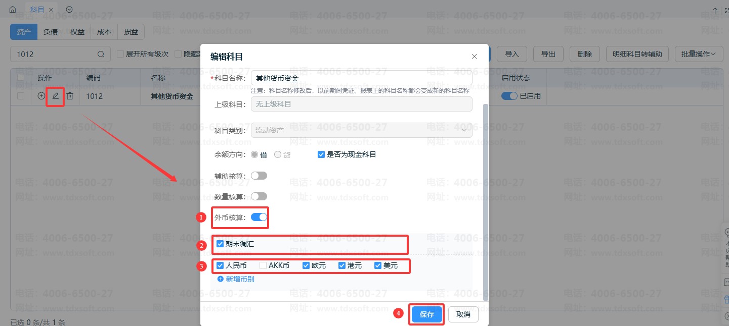 进入【设置】-【科目】界面,点击对应科目前面的小铅笔按钮,可打开科目详情启用“外币核算”。