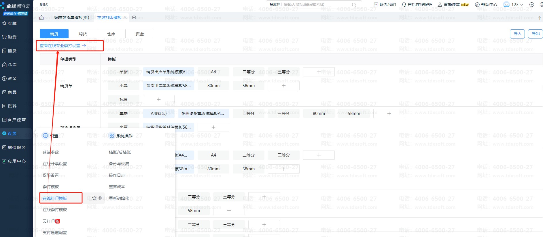 首先,点击【设置】-【在线打印设置】-【在线专业套打】进入模板界面,如图: