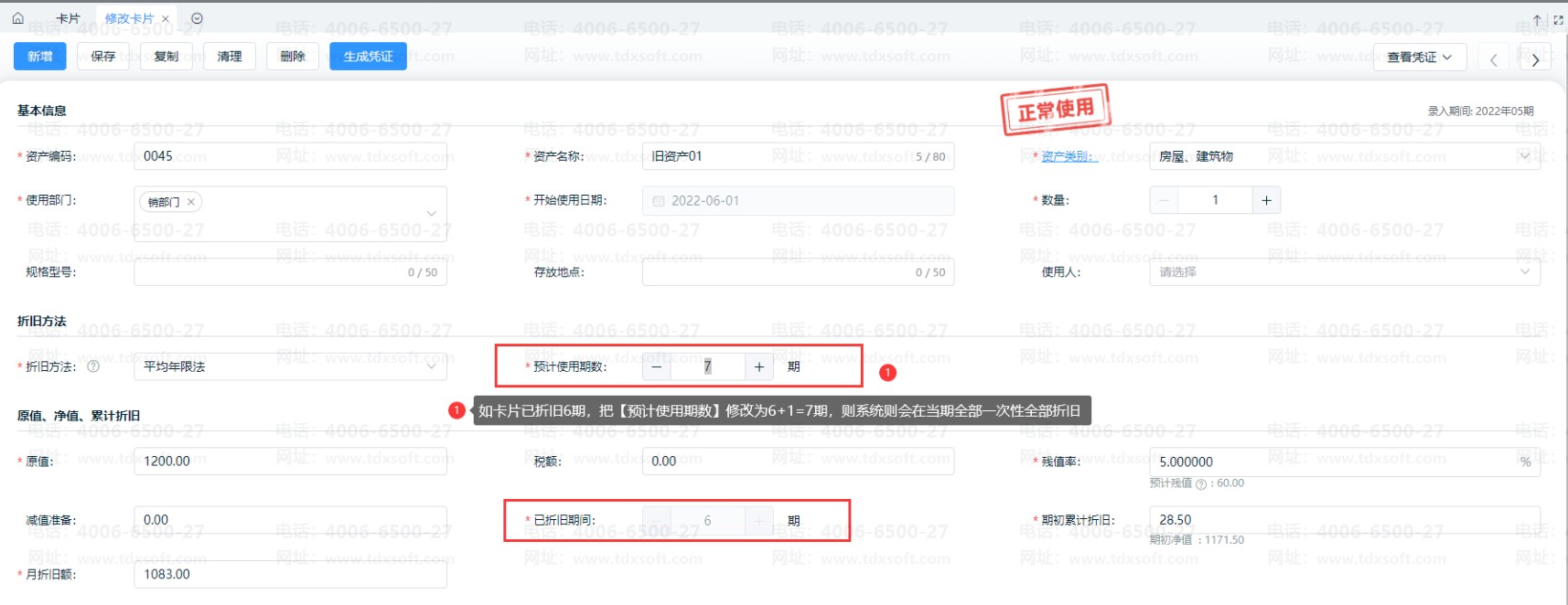 已折旧期间为6,所以把预计预计使用期数改成6+1=7期,在本期就会全部计提。
