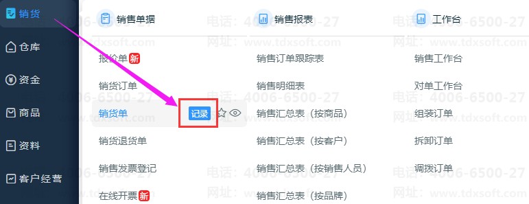 1、首先点击【销货】-【销货单记录】界面(其他单据则同理,点击对应单据记录界面)