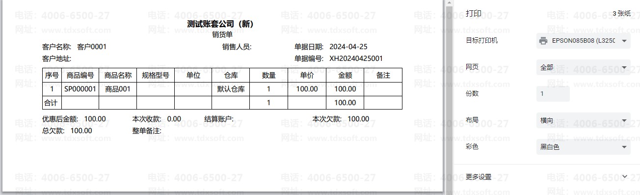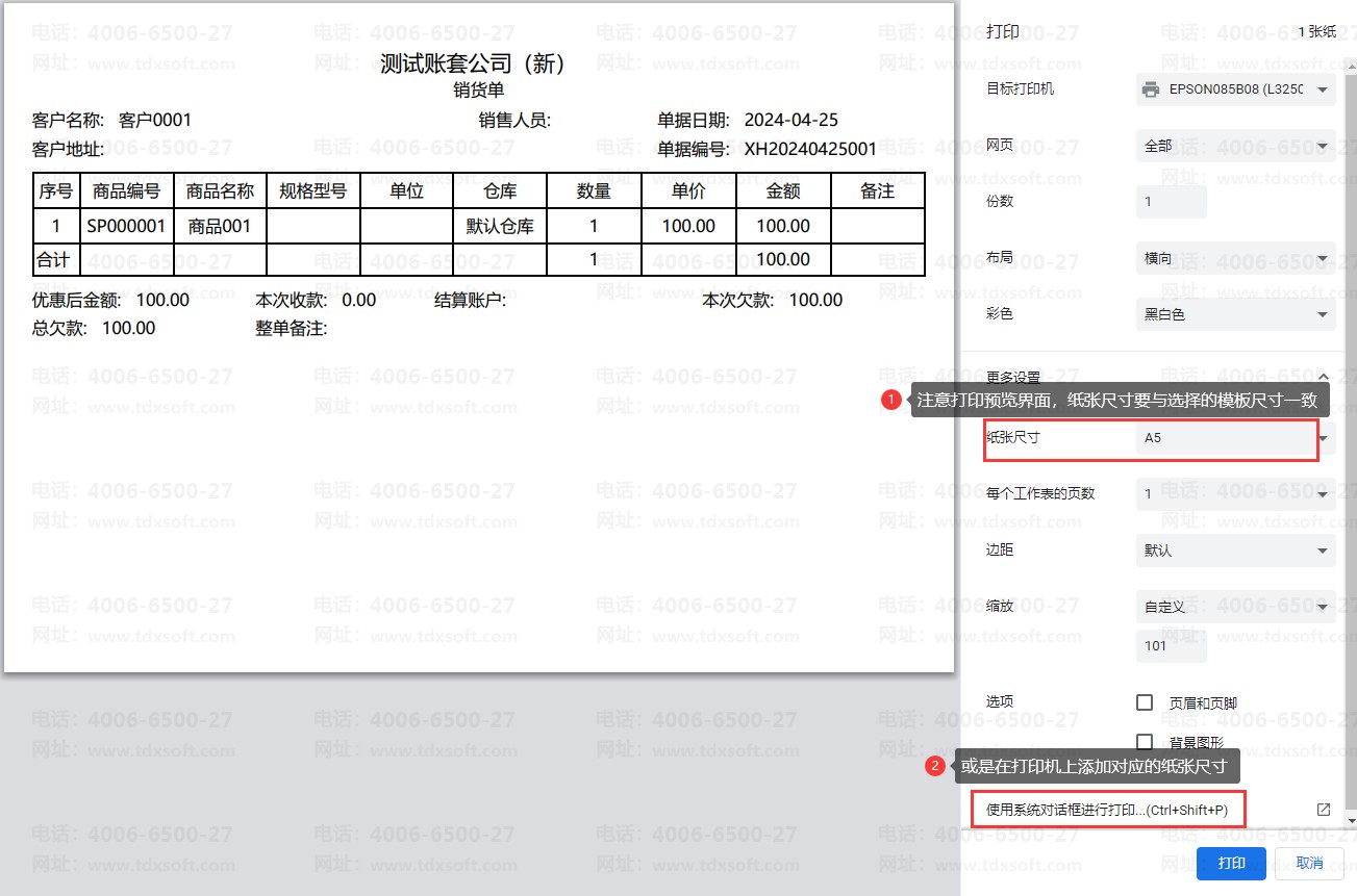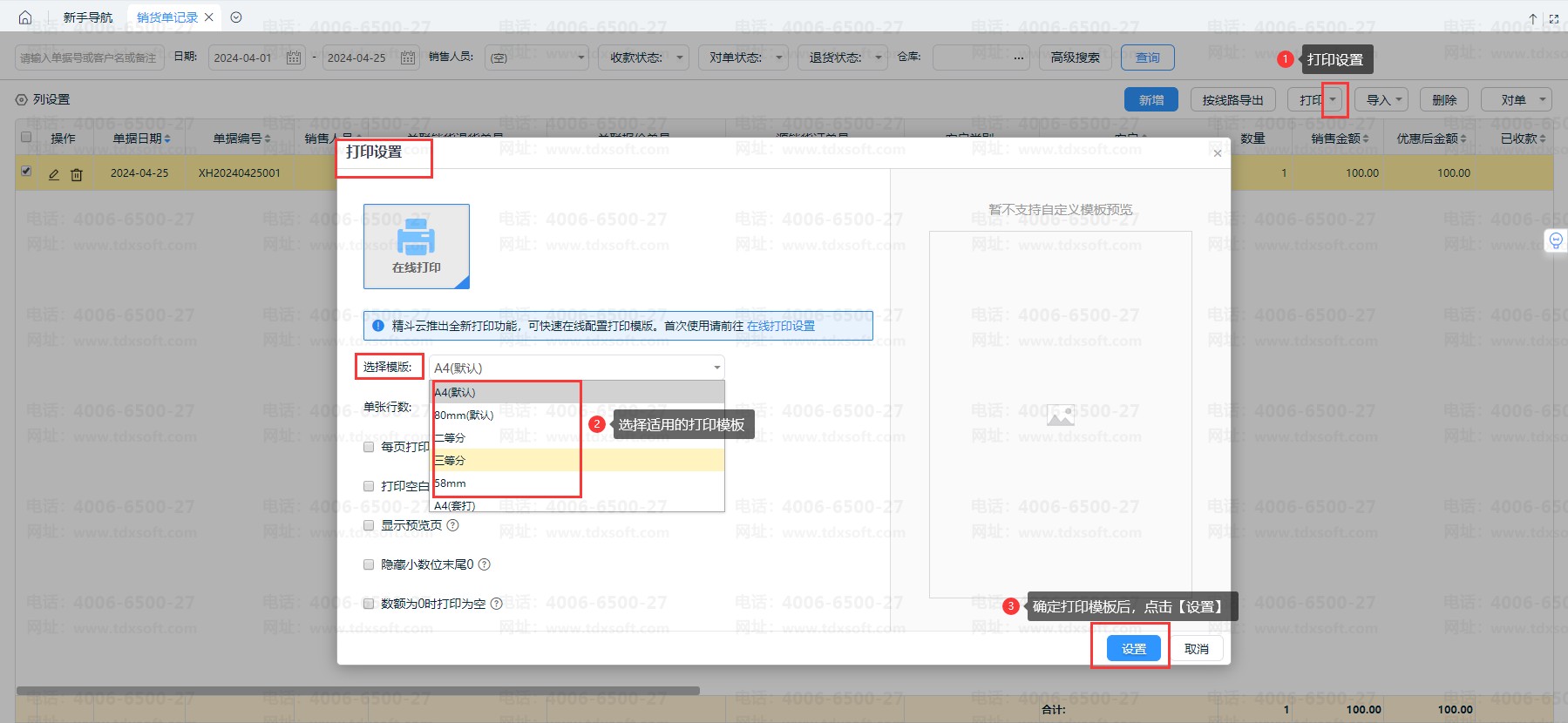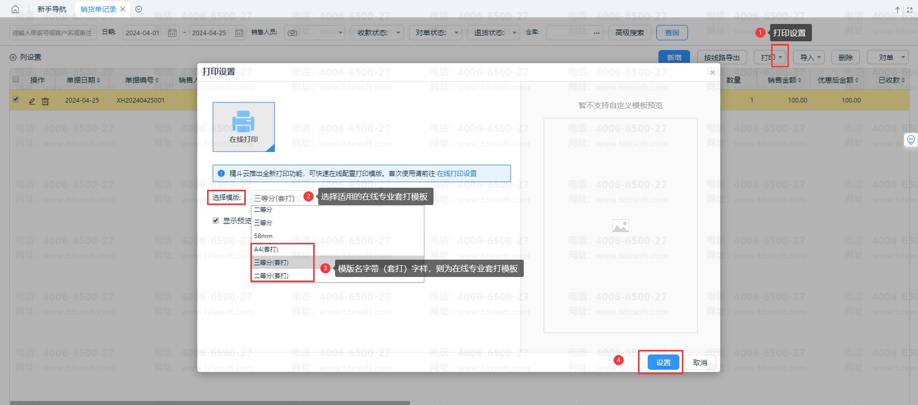1、【销货单记录】-【勾选打印单据】-【打印设置】-打印模板名字带(套打)字样的,则为在线专业套打模板。