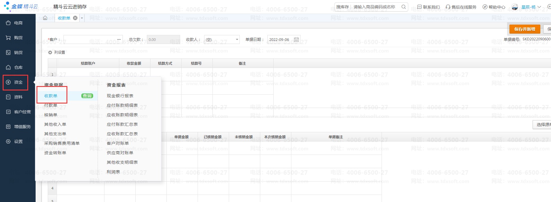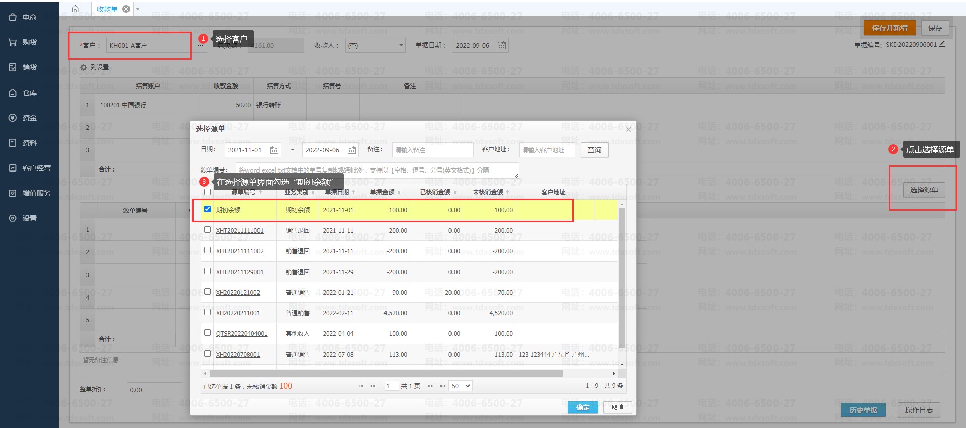 A客户的期初应收款是100,2022年9月6号收款50,则通过【资金】系统新增收款单,选择“A客户”,点击右侧的【选择源单】功能,在弹出的选择源单界面选择“期初余额”。