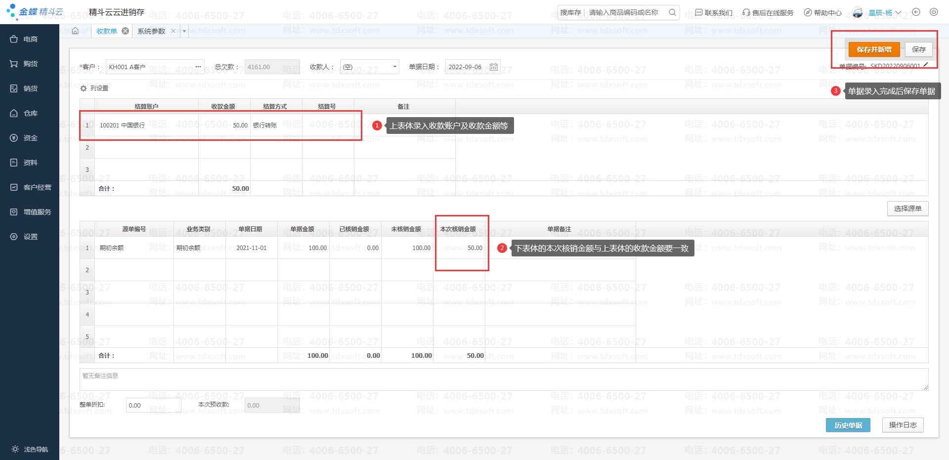 选择源单后在上表体中录入“结算账户”、“收款金额”等,下表体的源单信息中注意将本次核销金额修改为与收款金额一致,如本次收款50元,则需要将本次核销金额修改为“50”。单据信息录入完成后点击右上角【保存】或【保存并新增】即可。