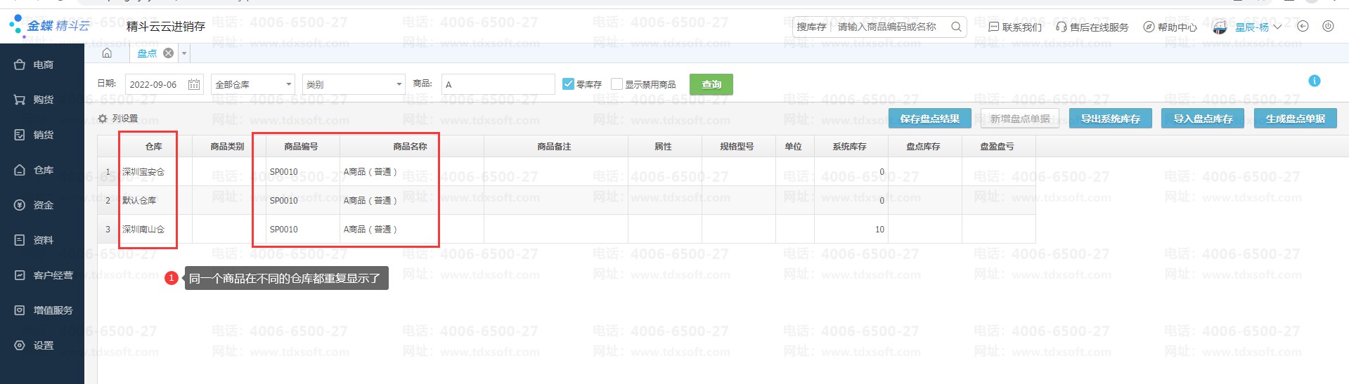在仓库盘点时商品在每个仓库都重复显示一次,如:系统有3个仓库,但是A商品只在“深圳南山仓”有10个库存,但是盘点时3个仓库重复显示了这个商品资料。