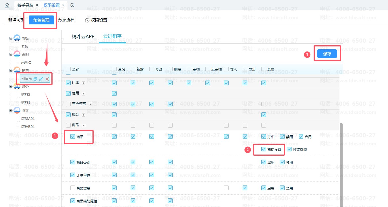 2、查看子账号分配的角色,然后在【角色管理】-【进销存】-【商品】,勾选【期初设置】权限,最后【保存】。如图,子账号为“销售员”角色。