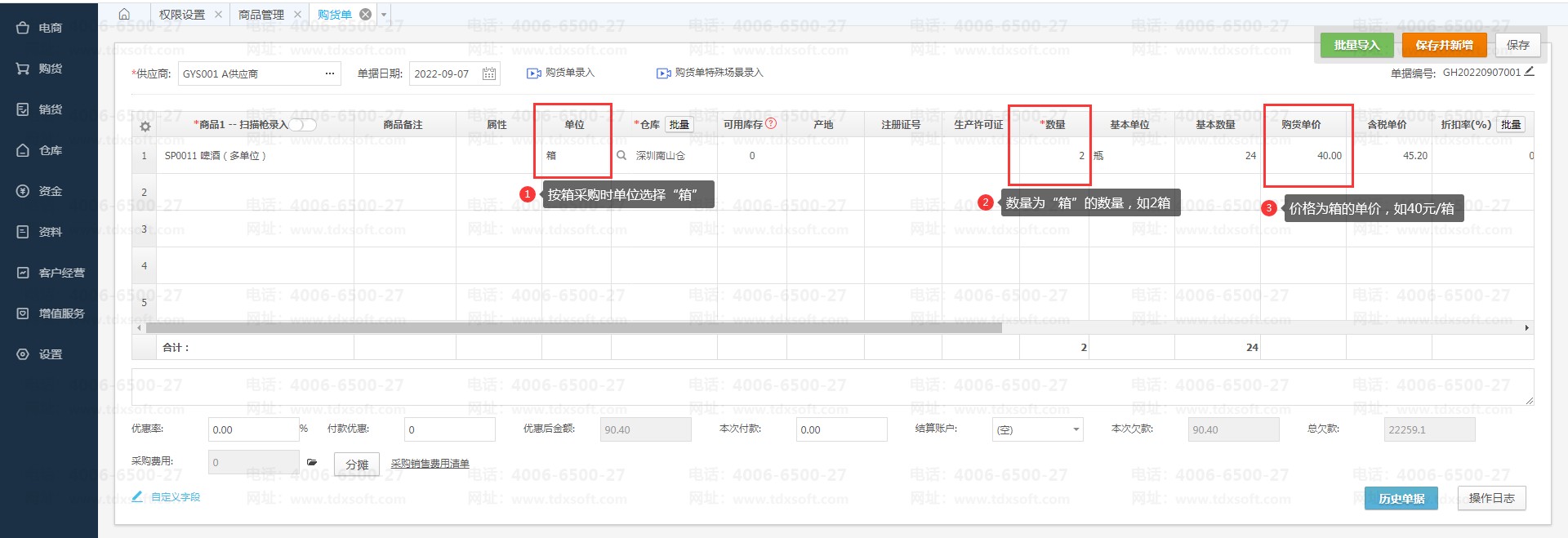 如:瓶酒启用了多单位管理:1箱=12瓶,采购入库的时候是按箱入库的,则在录入购货单时单位选择“箱”,数量2箱,单价为箱的价格40元/箱。