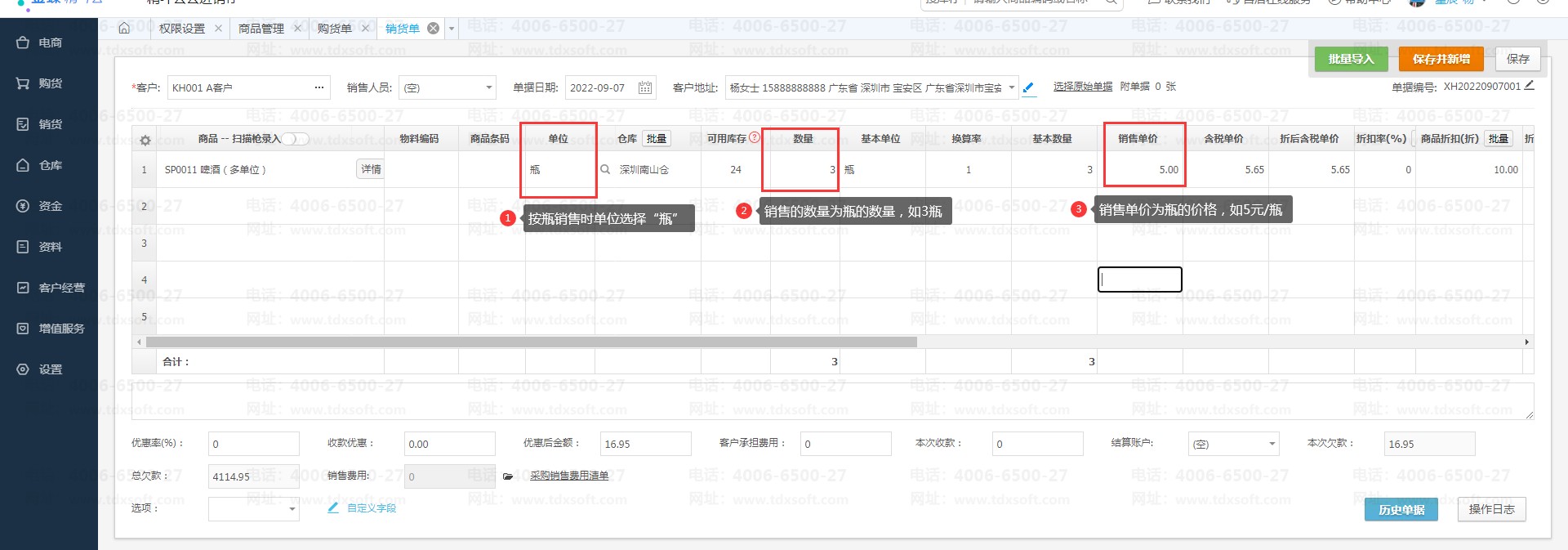 销售出库时按瓶销售,则录入销货单时单位选择“瓶”,数量3瓶,单价为瓶的价格5元/瓶。