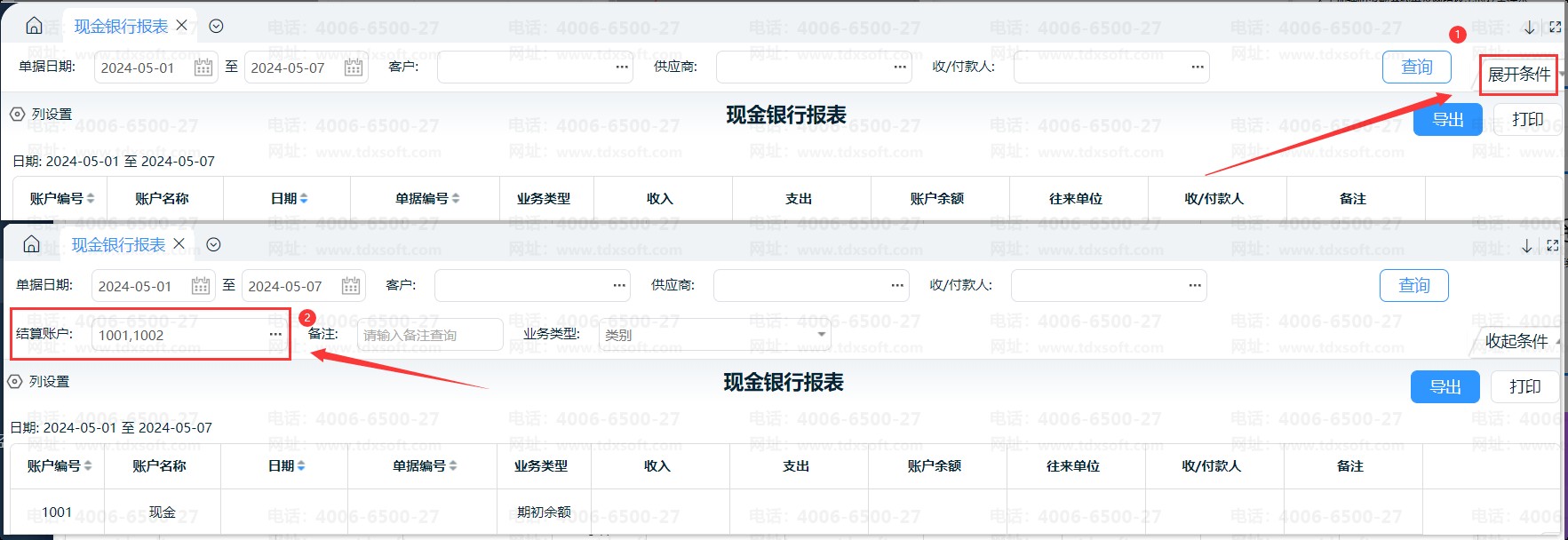 注意:若表头没有【结算账户】选项,请点击【展开条件】,展示所有查询条件,再进行操作。