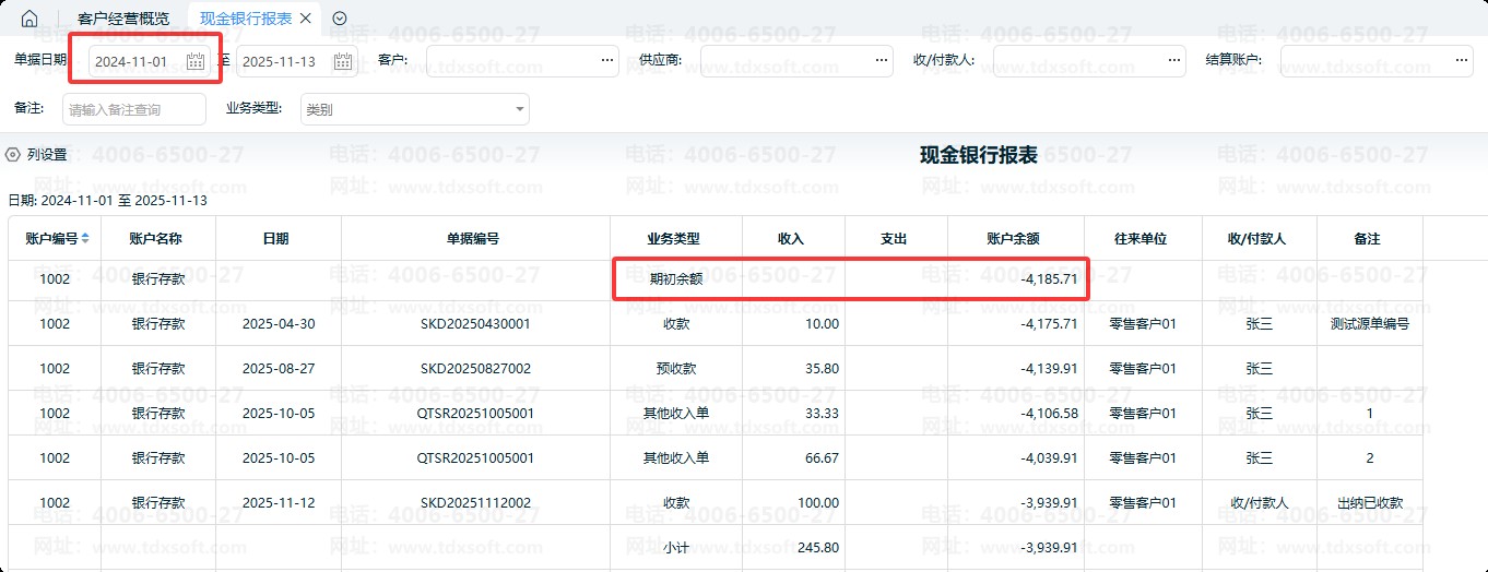 例如:若当前查询的 “开始日期” 为2024年11月01日,那么 “银行存款” 账户的期初余额,就是2024年10月31日该账户的结余金额。