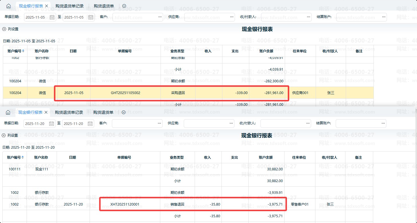 ④购货退货并同步退款时,以支出负数体现;销货退货并同步退款时,以收入负数体现。如图所示: