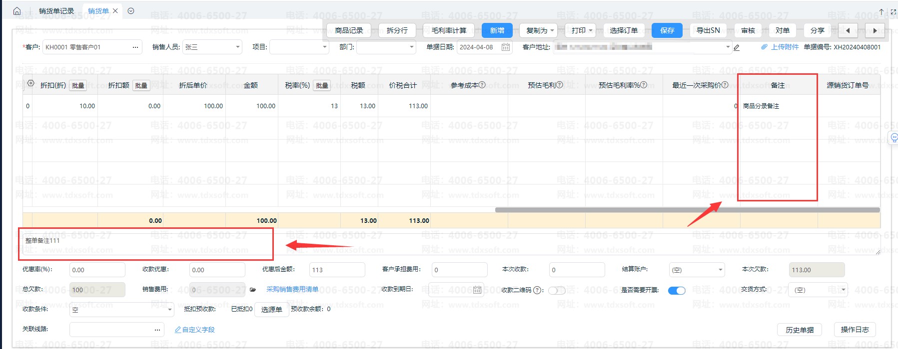 整单备注:是对整个单据的相关信息进行说明,针对的是一笔单据的整体情况说明。整单备注单据表尾。