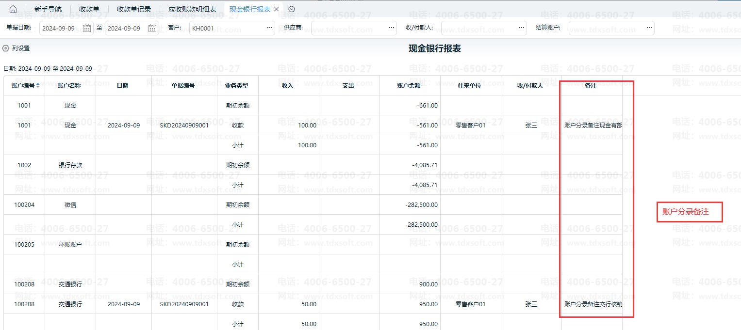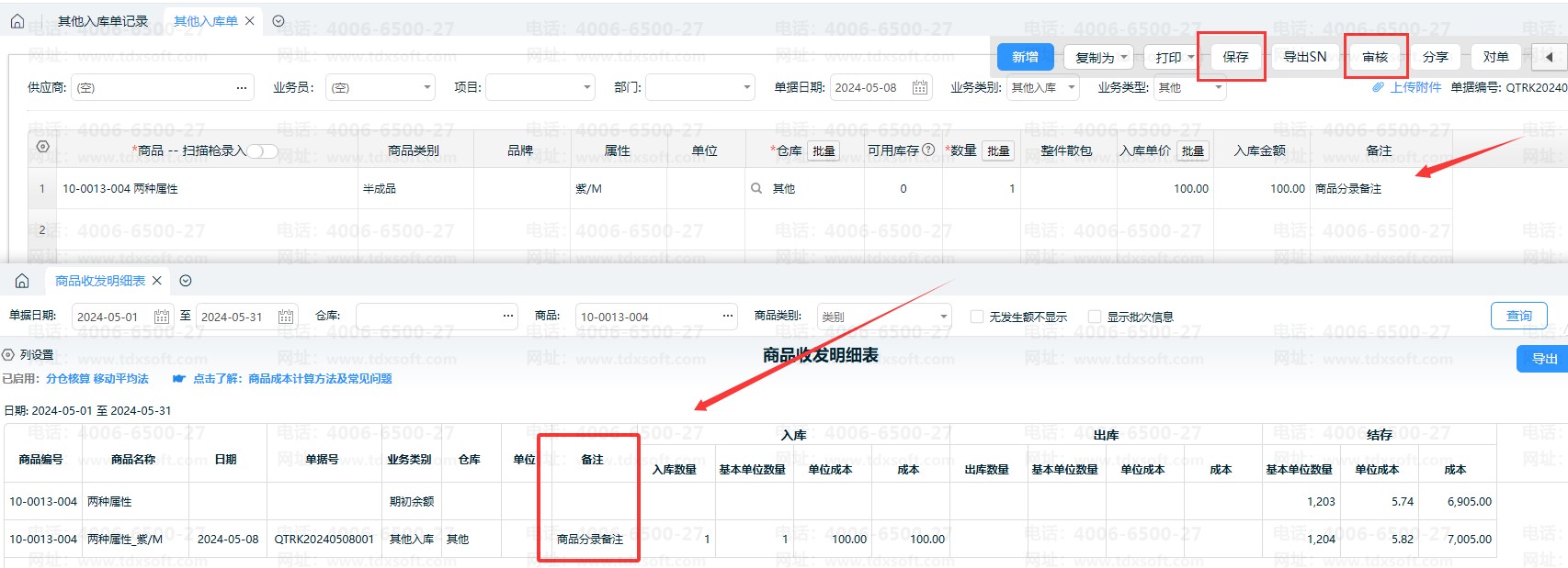 如:其他出入库单据可在商品收发明细表查询分录备注