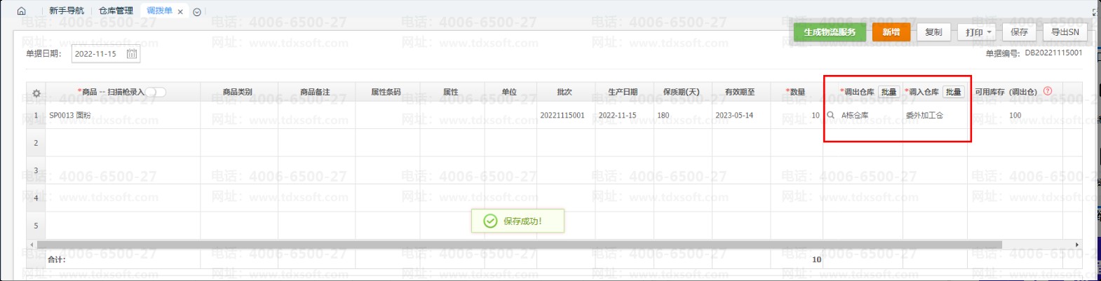 1、前置准备:先在系统中创建虚拟的“委外加工仓”,将采购进来的原材料,通过【调拨单】从企业实际仓库调拨至“委外加工仓”。