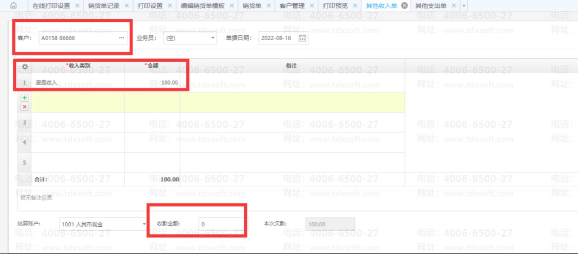 1、做其他应收或其他应付挂账时,新增其他收入或其他支出单需要选择对应的客户或供应商,录完单据后,将底下的【收款金额】/【付款金额】数字调整为0,保存审核单据生效即可生成对应的应收或应付款