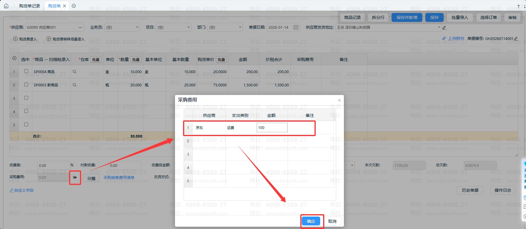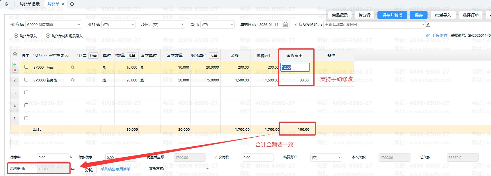 ②采购费用自动分摊到表体商品分录的 “采购费用” 金额支持手动修改或删除,但修改后表体所有商品的采购费用合计必须与表尾的【采购分摊】总金额保持一致。