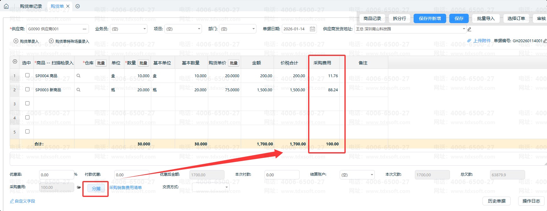2、回到单据编辑界面,【采购费用】显示录入的金额,然后点击【分摊】按钮,将采购费用分摊至商品成本,增加商品的入库成本。