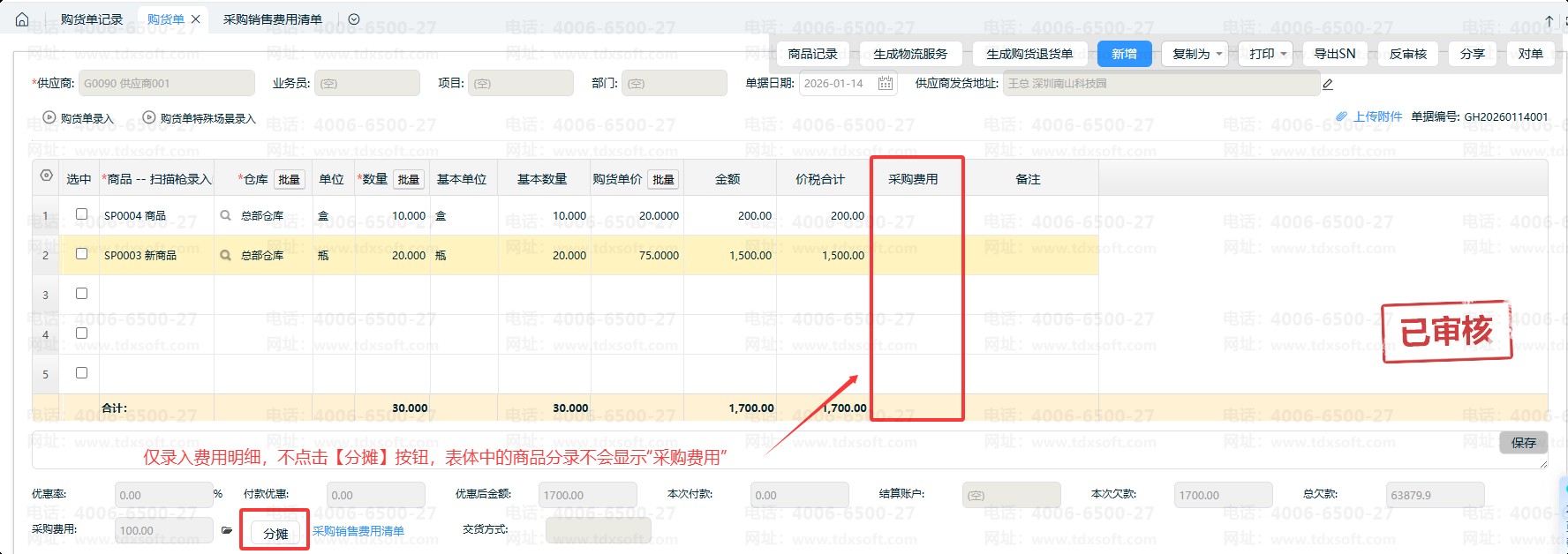 1、若采购费用不需要分摊,仅做为费用记录,按“方式一”录入采购费用明细后,不要点击【分摊】按钮,则表体中商品分录不会显示“采购费用”。