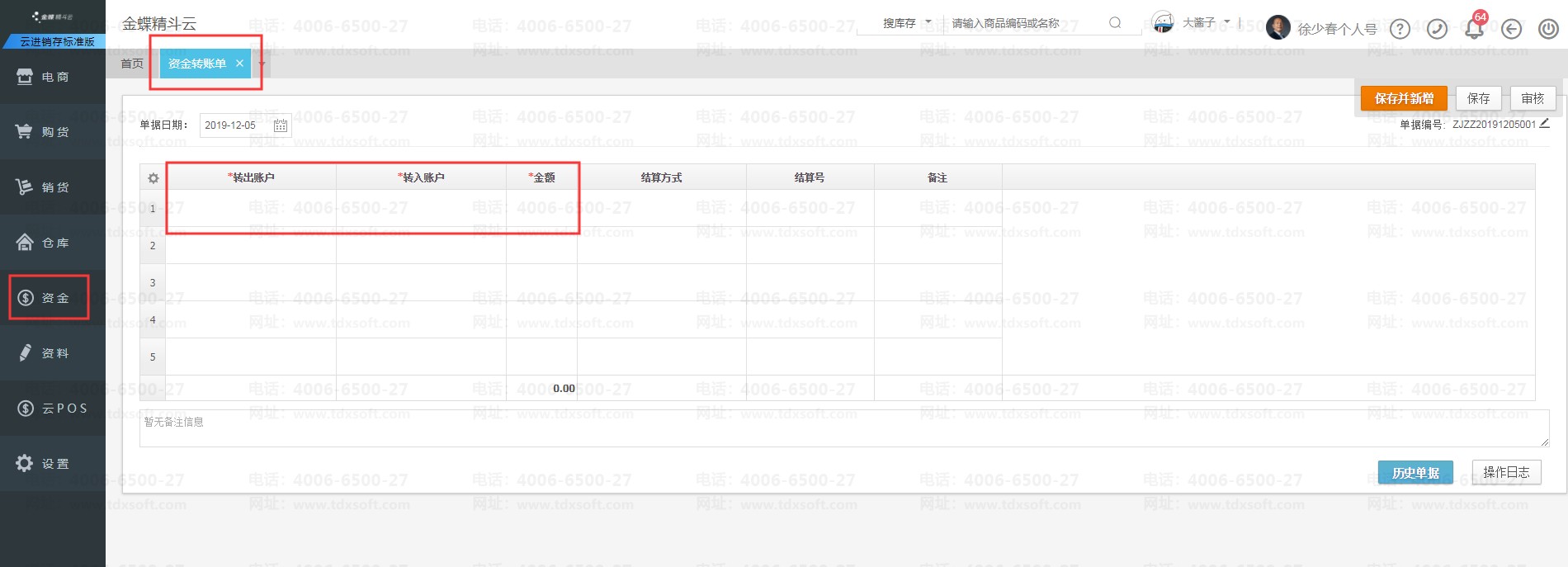 1、【资金】-【资金转账单】,填入金额及账户信息,即可将A账户的资金,转移到B账户