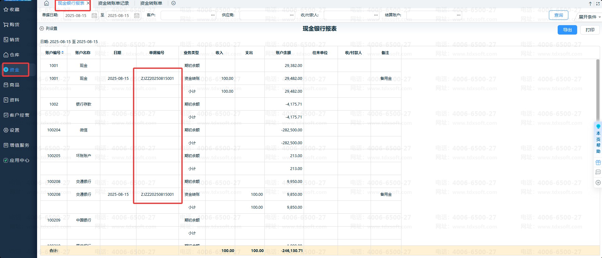 说明:资金转账单保存成功后,转出账户余额直接减少,转入账户余额直接增加,不涉及到往来挂账。