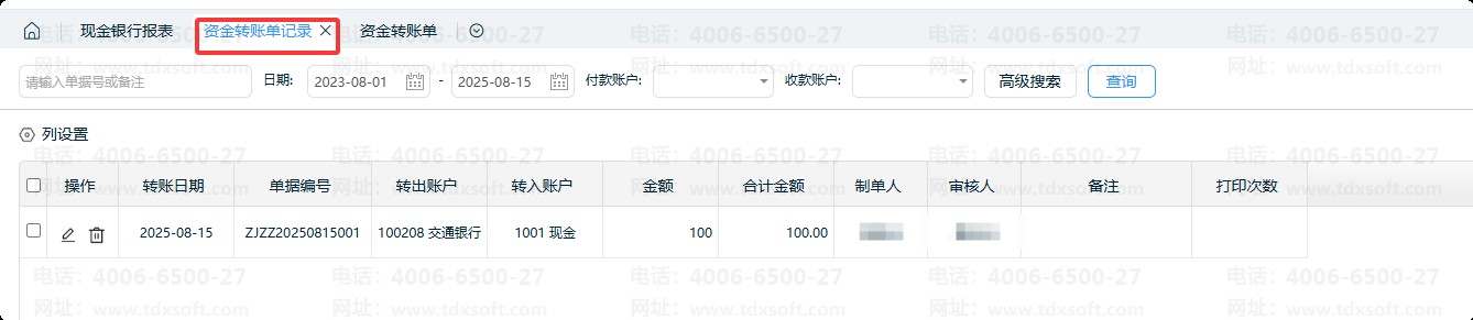 资产转账单保存成功后,可在单据列表或是现金银行报表查询。