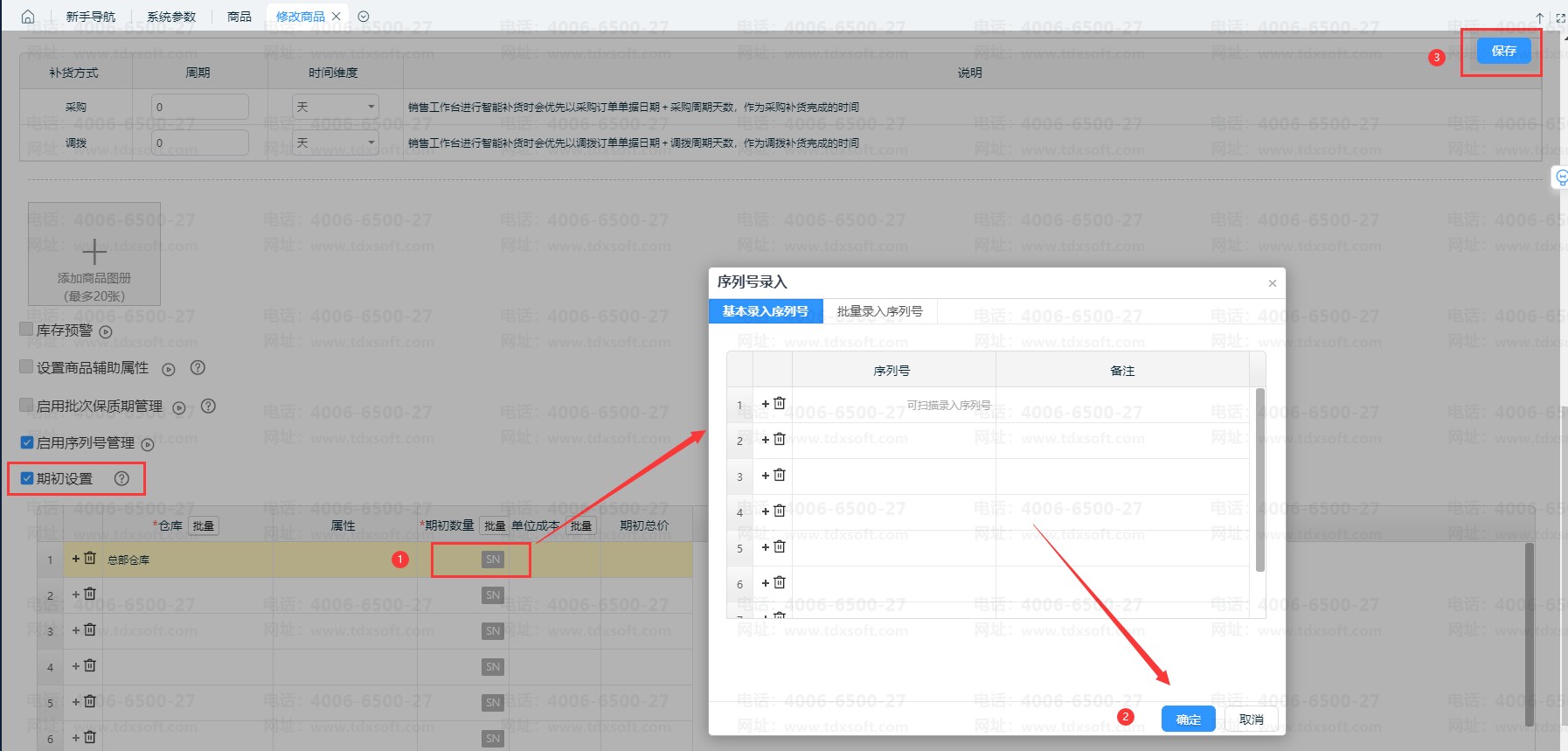 ①录入商品期初数据时,点击【数量】则会弹出录入序列号的对话框,一个数量对应一个序列号,且序列号不允许重复。(在“添加”栏可通过扫描枪快速录入,或直接从Excel表格整列复制粘贴批量录入)