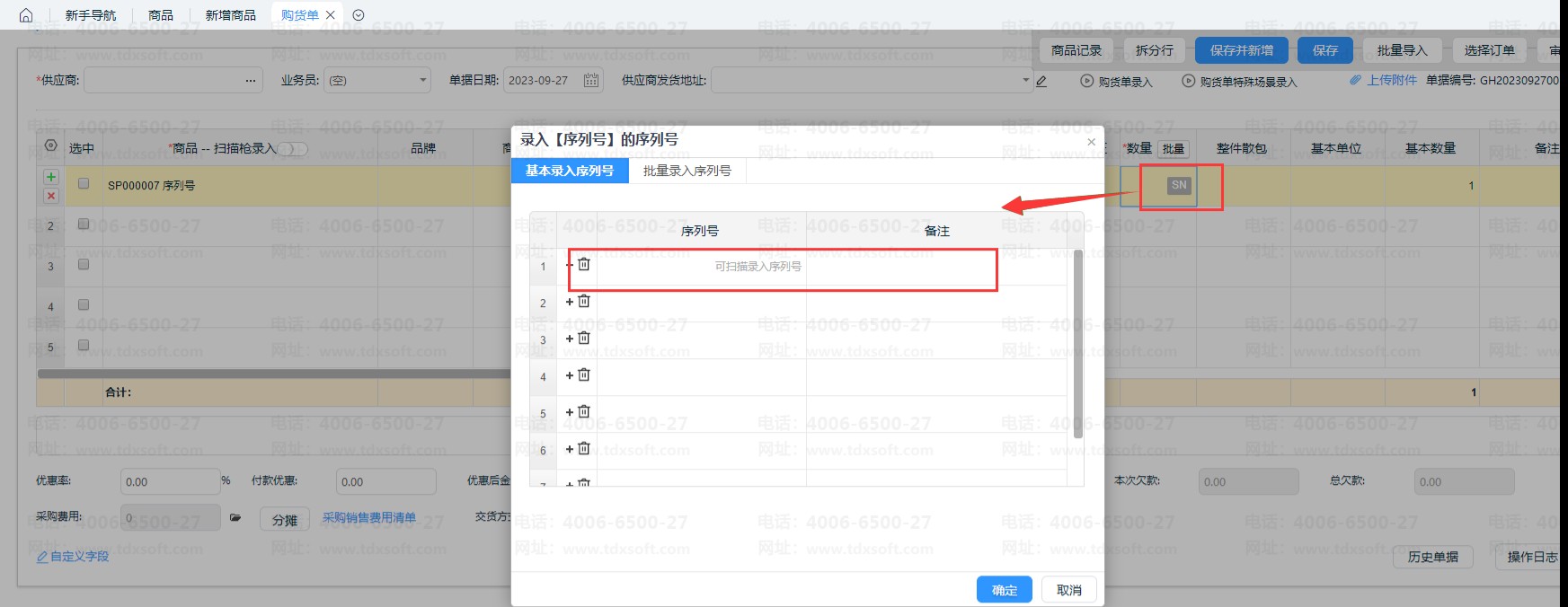 ②编辑购货单、其他入库单等入库类单据,选择序列号商品,点击【数量】需添加序列号信息。