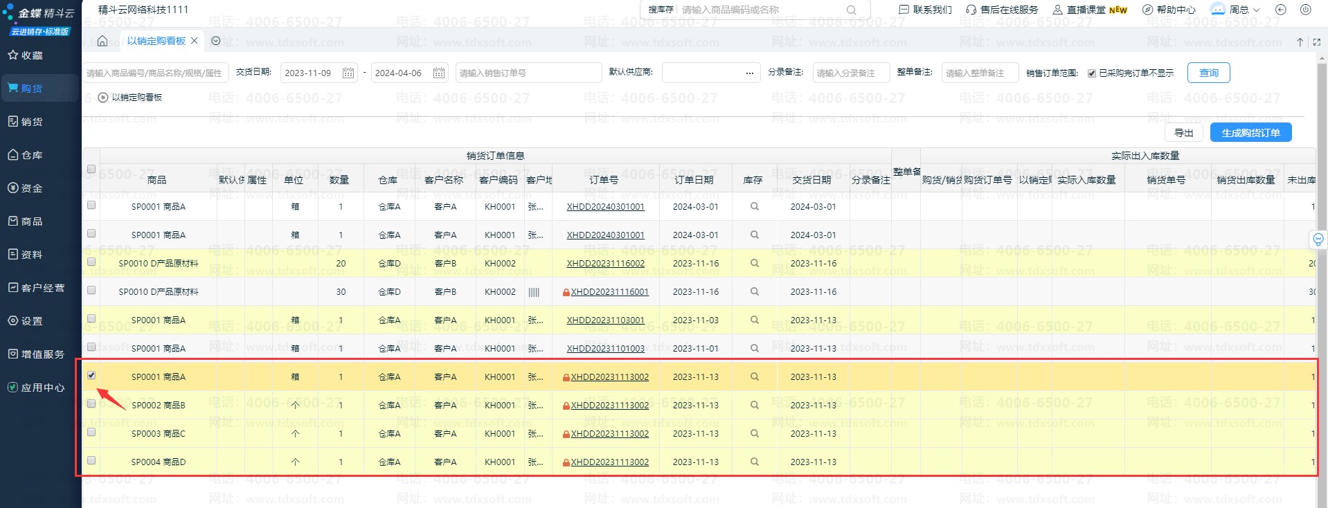 如图所示,销货订单XHDD20231113002有四种商品,以黄色底色与上一个订单区分;并且勾选其中一笔分录后,会以橙色底色突出显示。