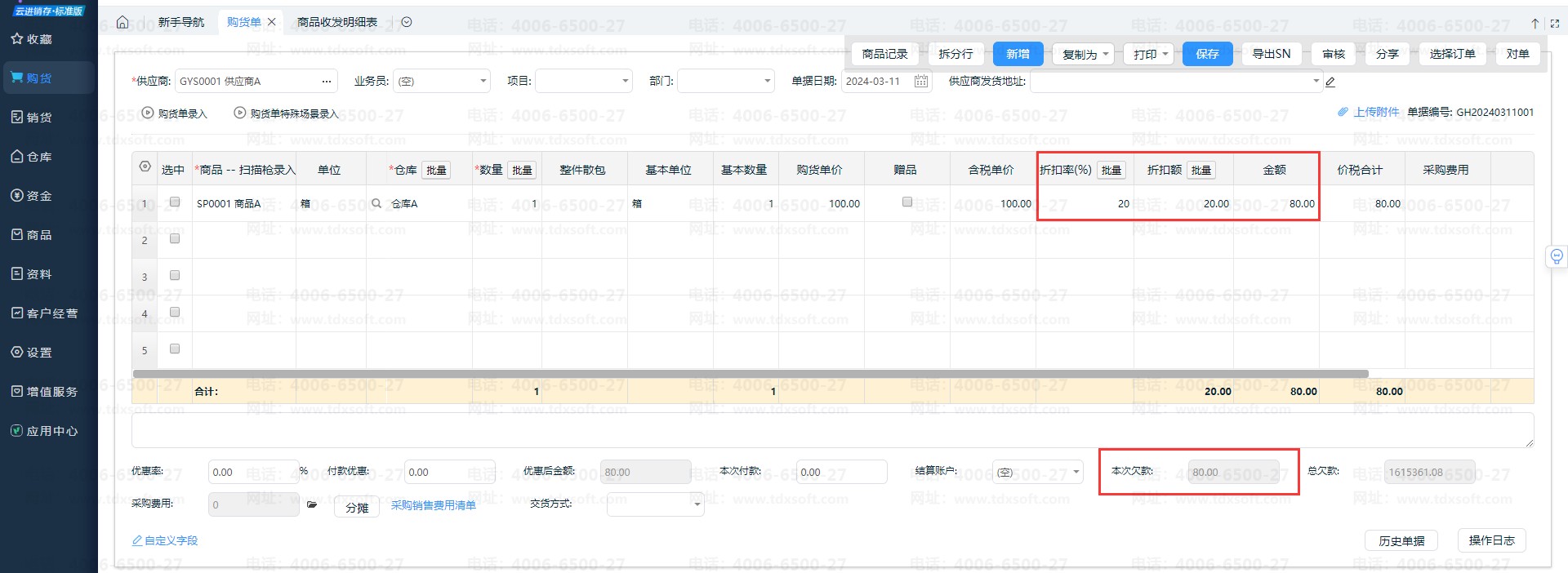 如采购总金额100元,打8折,则录入折扣率为20,折扣额为20元,入库成本为80元,应付80元