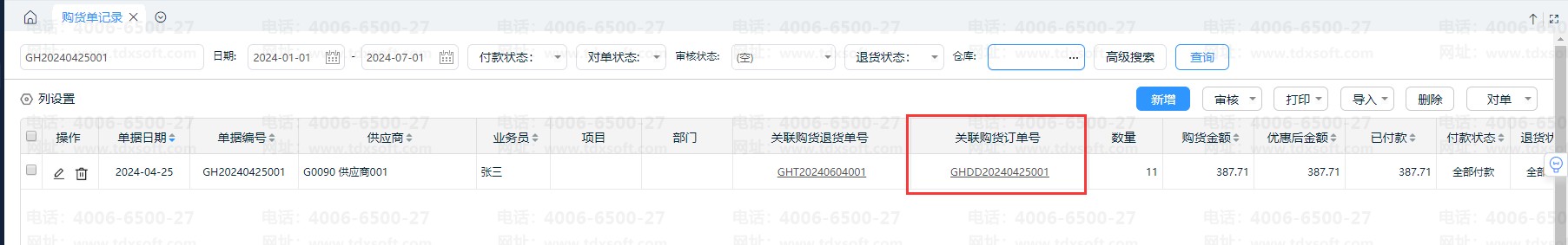 购货订单可以下推生成购货单,与购货单生成关联关系,详细操作可以点击:购货订单生成购货单入库,如何操作?