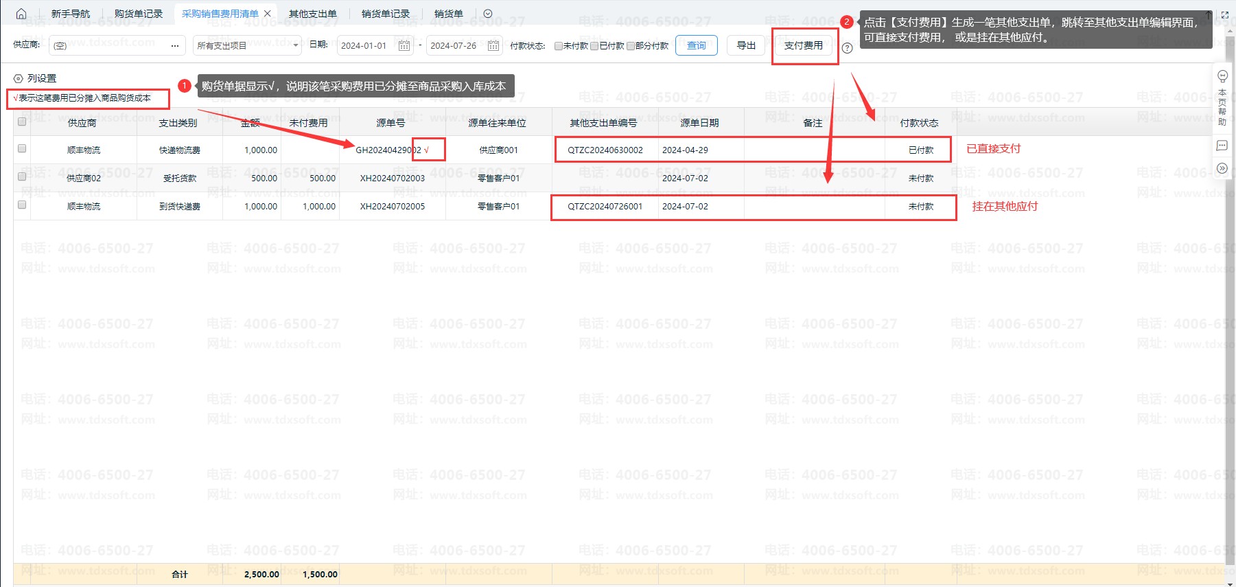 采购销售费用清单记录采购和销售业务产生的采购费用、销售费用以及往来单位信息,可在采购销售费用清单列表勾选单据批量支付费用并生成其他支出单。